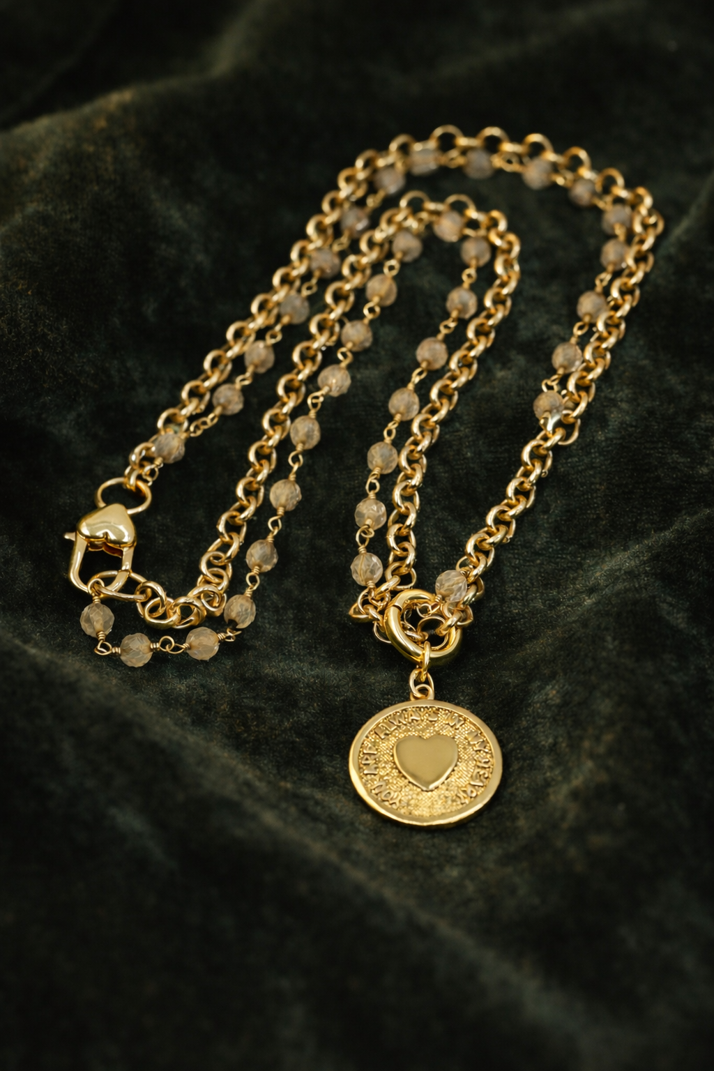 Two delicate strands wander beside each other, never quite identical, the way two hearts never beat in the exact same rhythm but still choose the same song. At the center hangs a gentle promise: a round golden seal holding a tender heart, as if love itself were pressed into metal and kept safe from time.